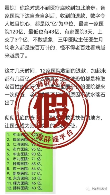 经上海辟谣平台核查比对,该组数据为自媒体账号凑合假造。通过检索,不错发现其数据源流实质是东说念主民日报健康客户端于4月份发布的著作《中国病院2023年收入预算前100公布》。该名单依据是天下各级政府部门发布的省属病院的2023年预算,由第三方机构“病院询查绩效新知”团聚500多份预算数据得回的。由此可见,关扫数据并非自媒体所称的“退款钱”。